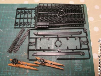 La boîte offre les deux barbotins, légèrement plus petits et plus étroits que ceux de la maquette originale, deux jupes latérales, moins hautes, deux patins de rechanges à coller sur l'avant du véhicule et 132 patins individuels pour confectionner les chenilles, soit deux patins de plus que nécessaire. Il ne faudra pas en perdre.