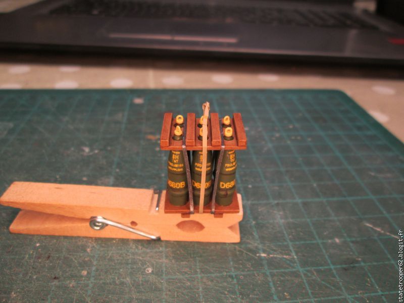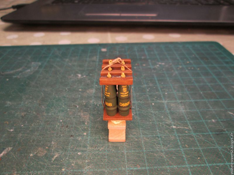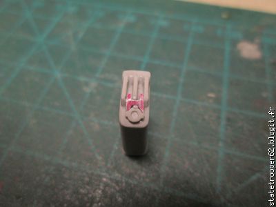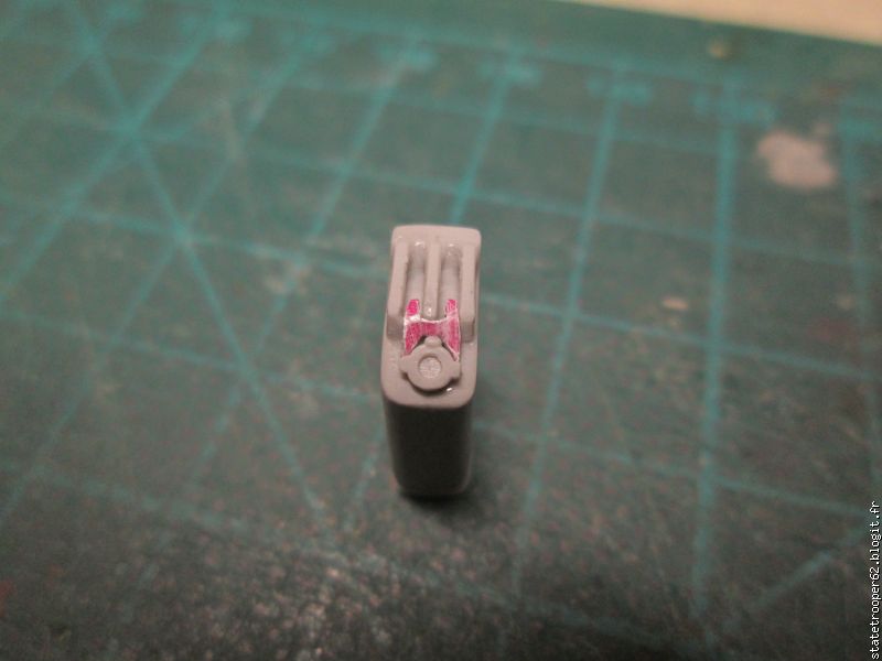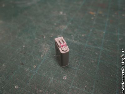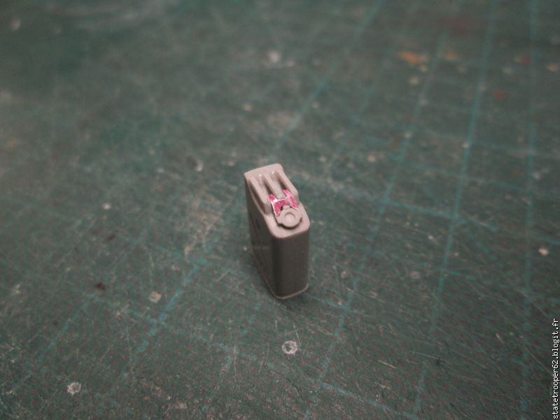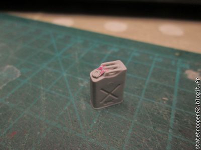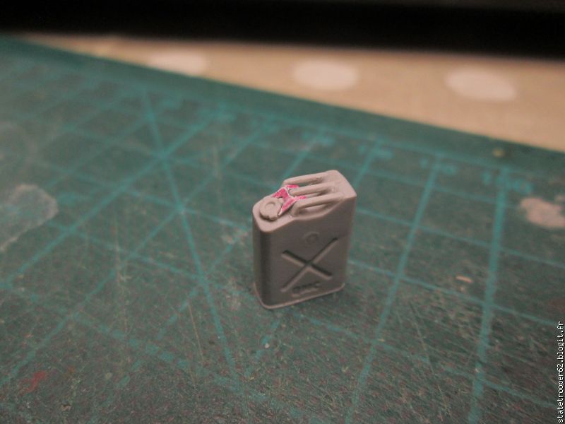 J'ai également bouché, à la superglue, la lettre G ( gas ) sur les deux faces latérales et collé une semelle sous la base en la faisant très légèrement déborder afin de représenter ce rebord caractéristique des bidons américains.