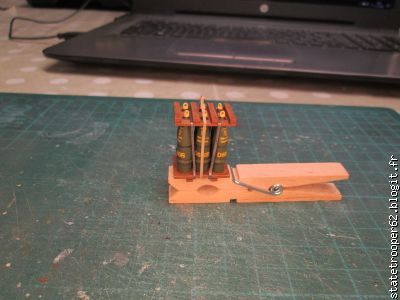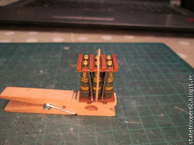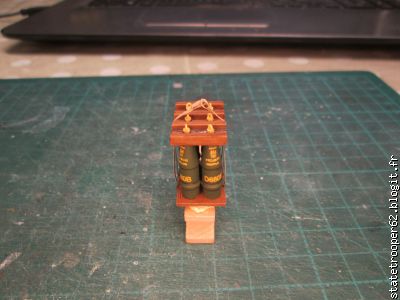 La sangle de portage est en papier et les cerclages sont en feuille de plomb qui s'est révélée pas assez rigide, il aurait mieux valu utiliser de la carte plastique.